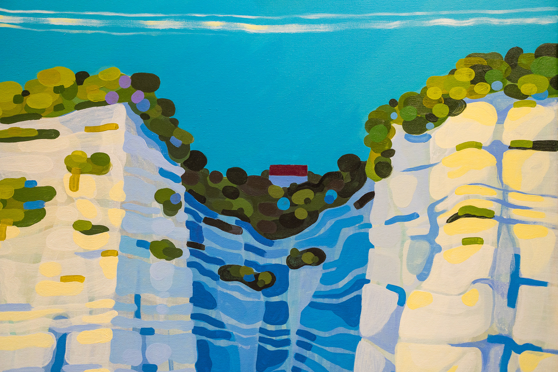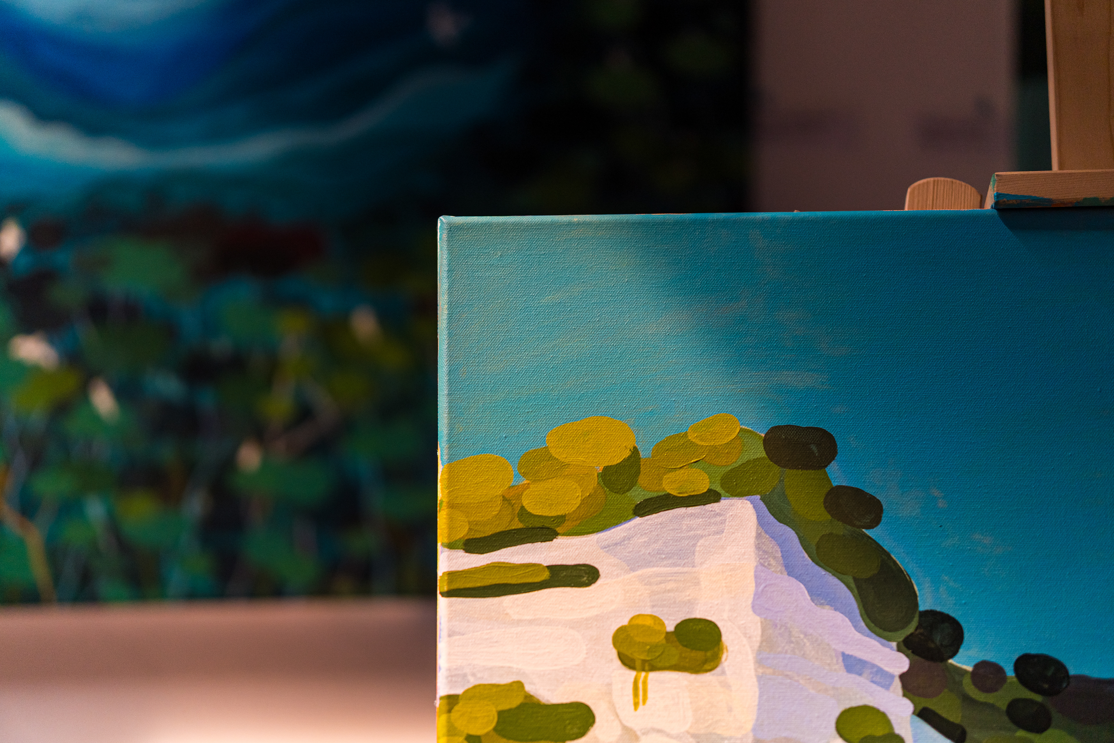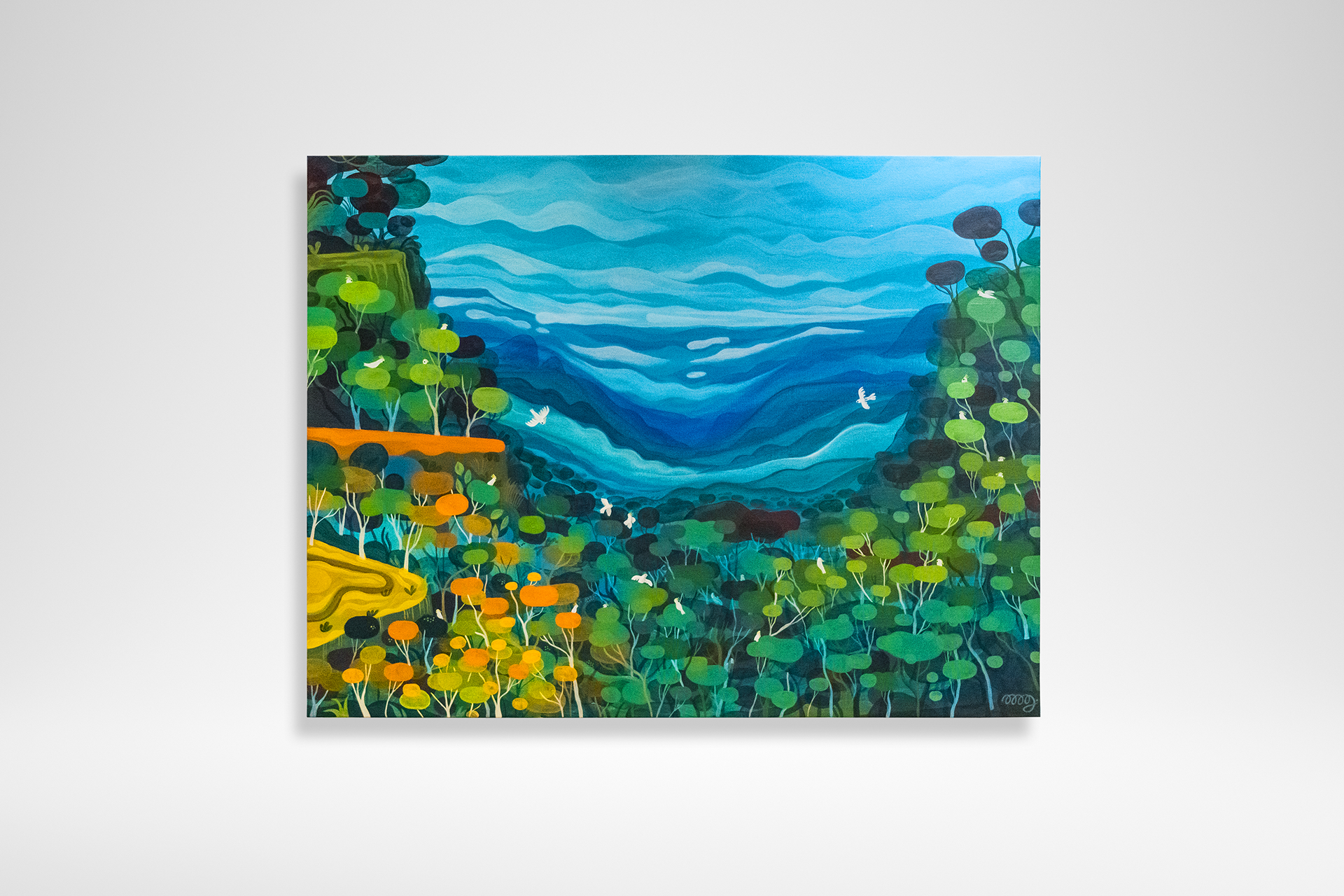 With Paysages fantasques, I wanted to immerse myself in larger formats and let colour guide my gestures. Acrylic, vivid and luminous, becomes the ground on which memory reshapes itself: fragments of real landscapes blend together to give rise to reinvented places.